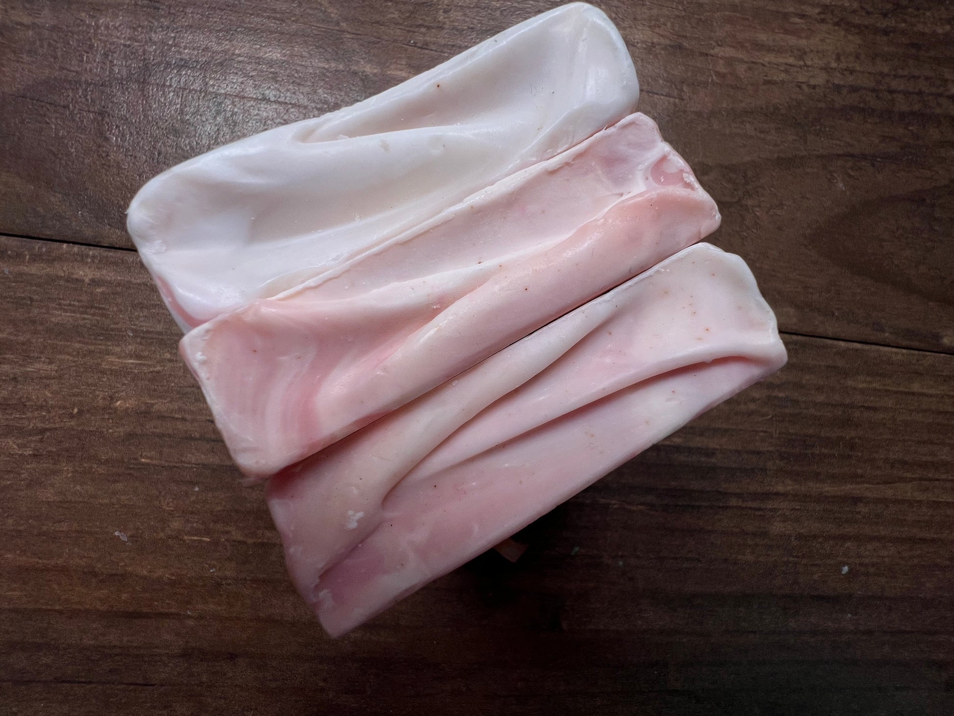 Ingredients: sunflower seed oil, coconut oil, distilled water, sodium hydroxide, castor oil, mango butter, kokum butter, cedar amber fragrance oil, colored naturally with brown Brazilian clay, and red mica.