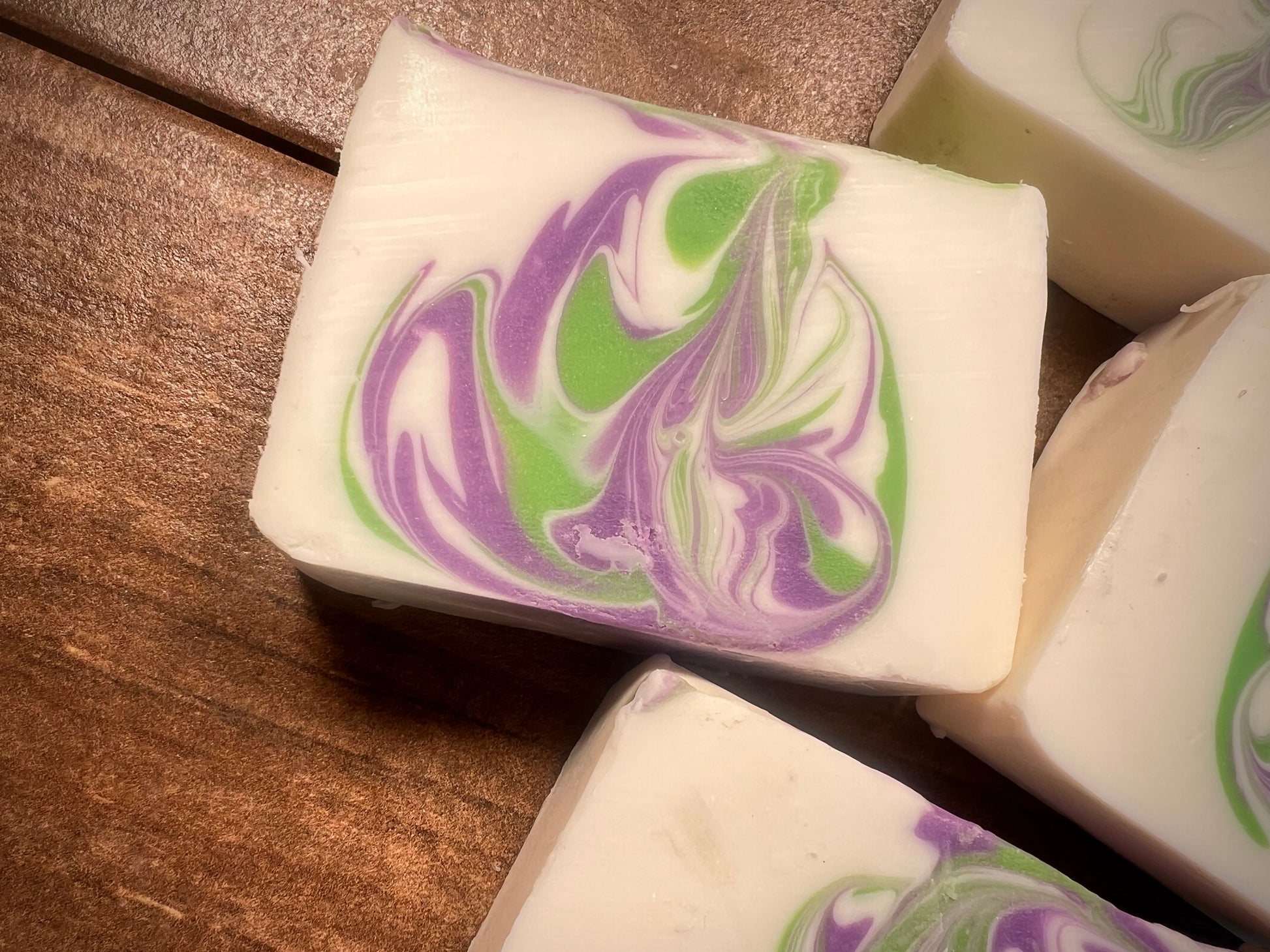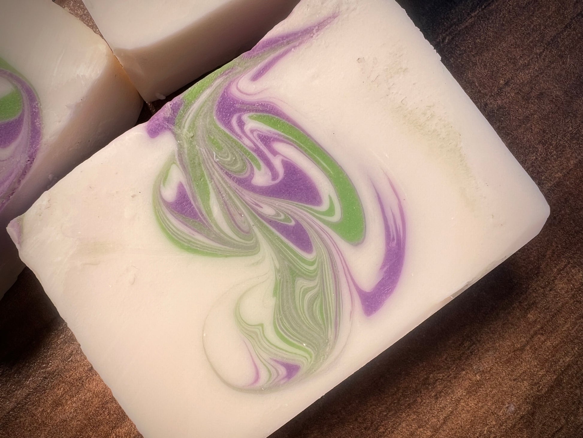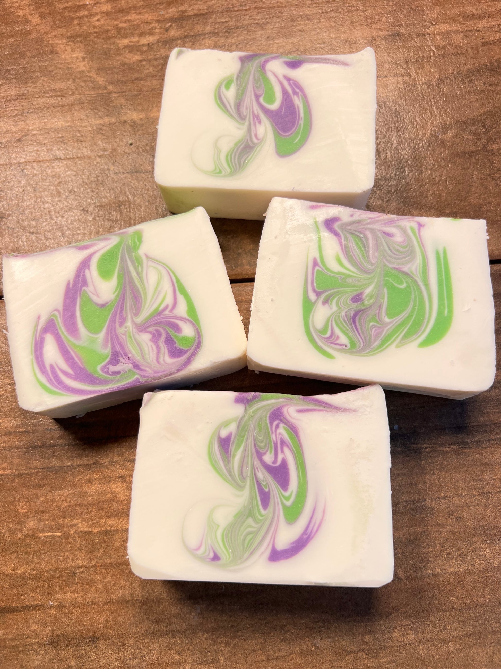 Ingredients: Sunflower seed oil, coconut oil, distilled water, sodium hydroxide, castor oil, kokum butter, mango butter, white lily aloe fragrance oil, colored naturally with mica colorants.