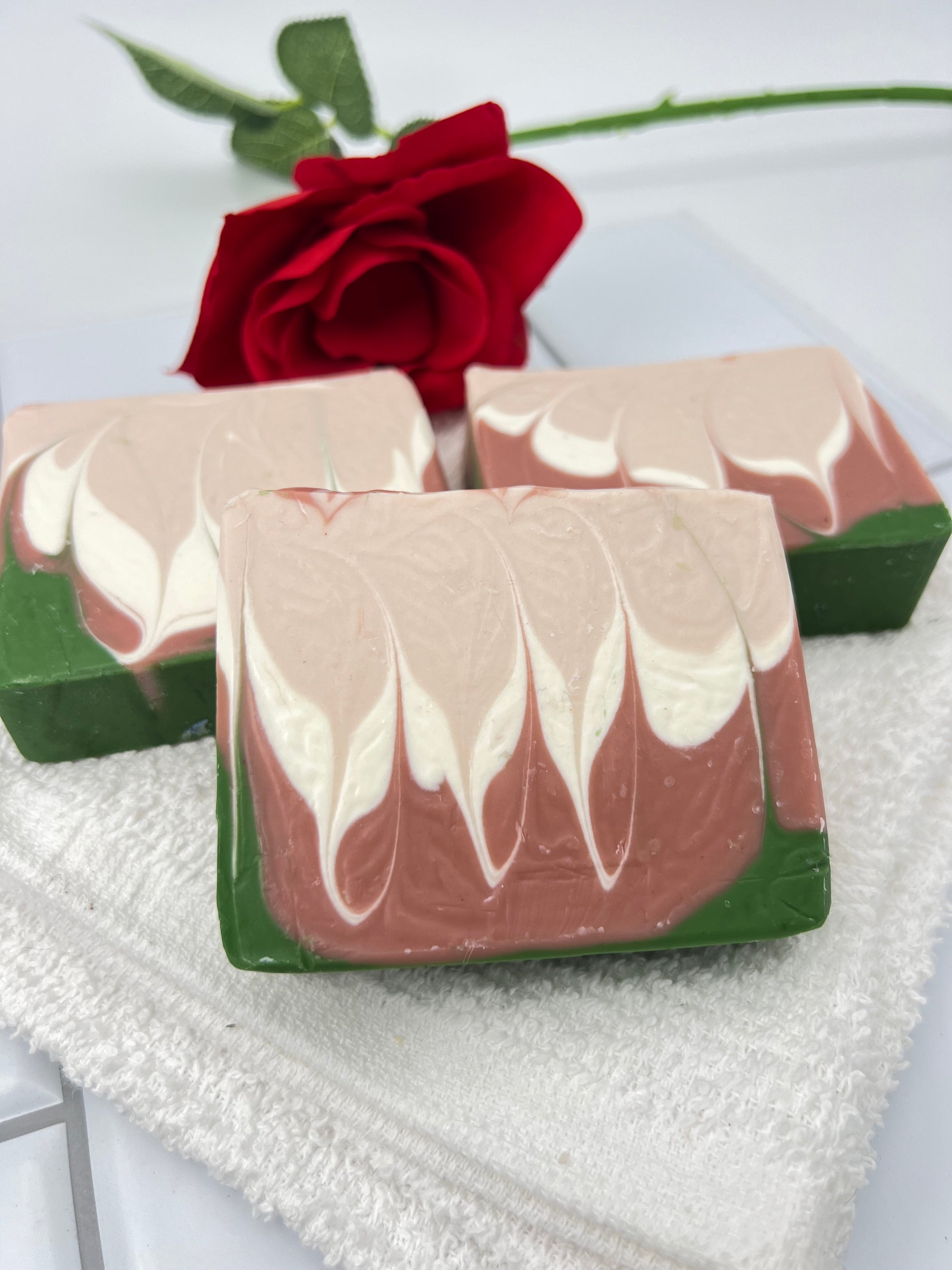Ingredients: Sunflower seed oil distilled water, coconut oil, sodium hydroxide, castor oil, mango butter, Kokum butter, wild rose fragrance oil, natural colorant, rose clay, matte green pigment powder, titanium dioxide